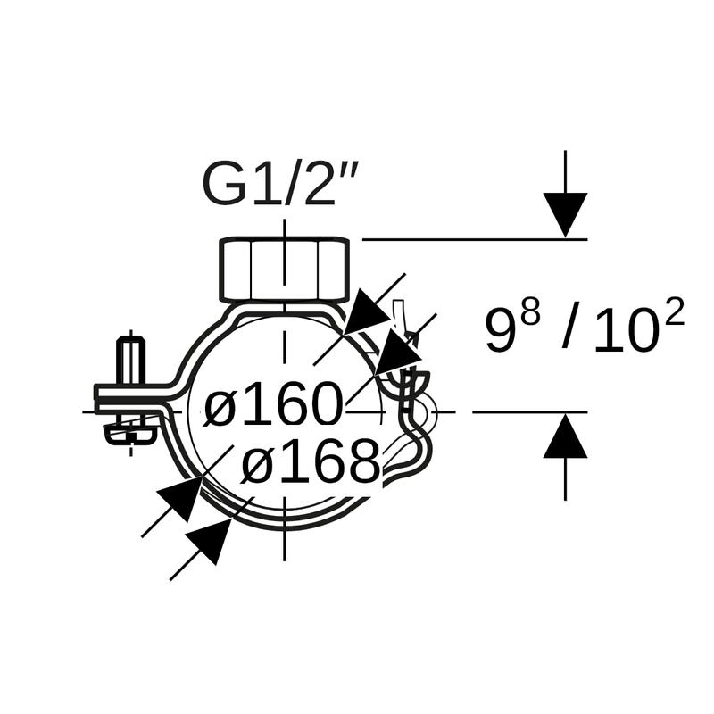 Geberit-putkikannake kierremuhvilla G 1/2", säädettävä: di = 160 mm, di1 = 168 mm.