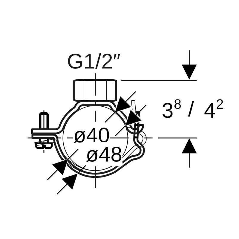 Geberit-putkikannake kierremuhvilla G 1/2", säädettävä: di = 40 mm, di1 = 48 mm.
