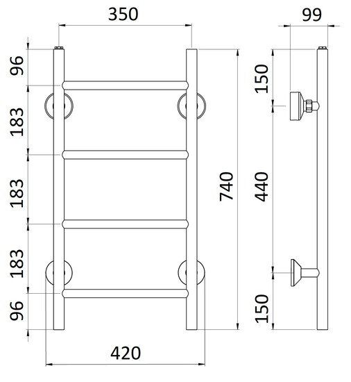 REJ Design Tango BTH 35744 musta pyyhekuivain, kytkentä ylhäältä. Kytkentäväli 350 mm.