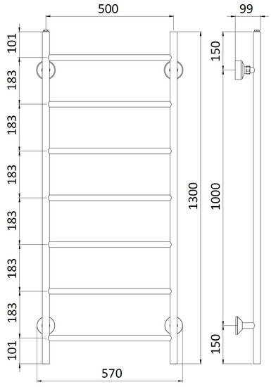 REJ Design Tango BTH 50130 musta pyyhekuivain, kytkentä ylhäältä. Kytkentäväli 500 mm.