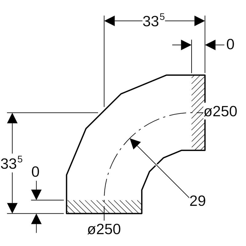 Geberit PE -segmenttikulmayhde: 90°, d = 250 mm.