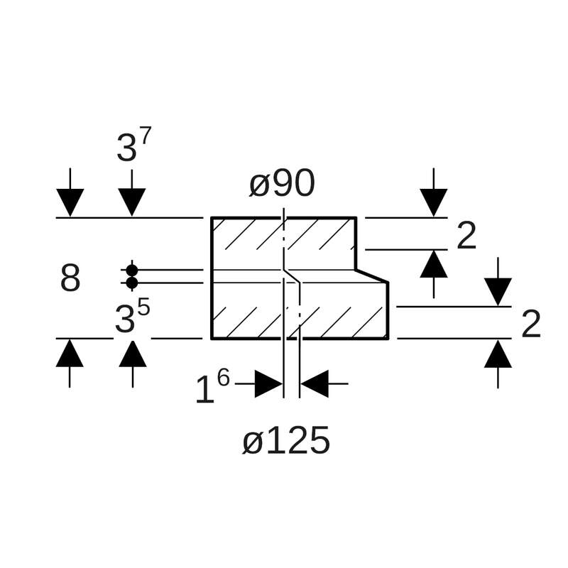 Geberit PE -supistus, epäkeskeinen, lyhyt: d = 125 mm, d1 = 90 mm.