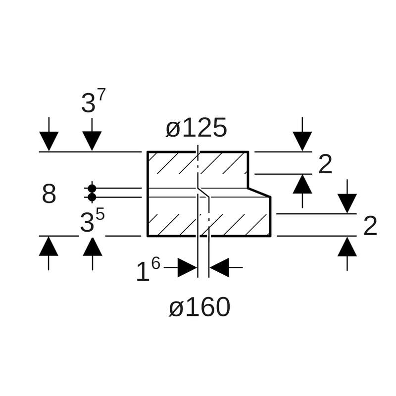 Geberit PE -supistus, epäkeskeinen, lyhyt: d = 160 mm, d1 = 125 mm.