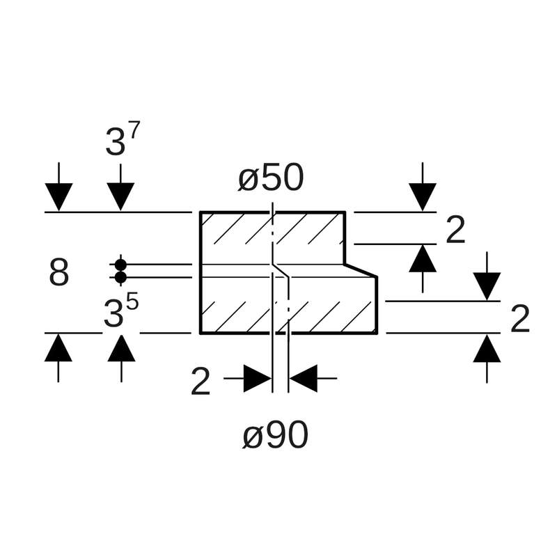 Geberit PE -supistus, epäkeskeinen, lyhyt: d = 90 mm, d1 = 50 mm.