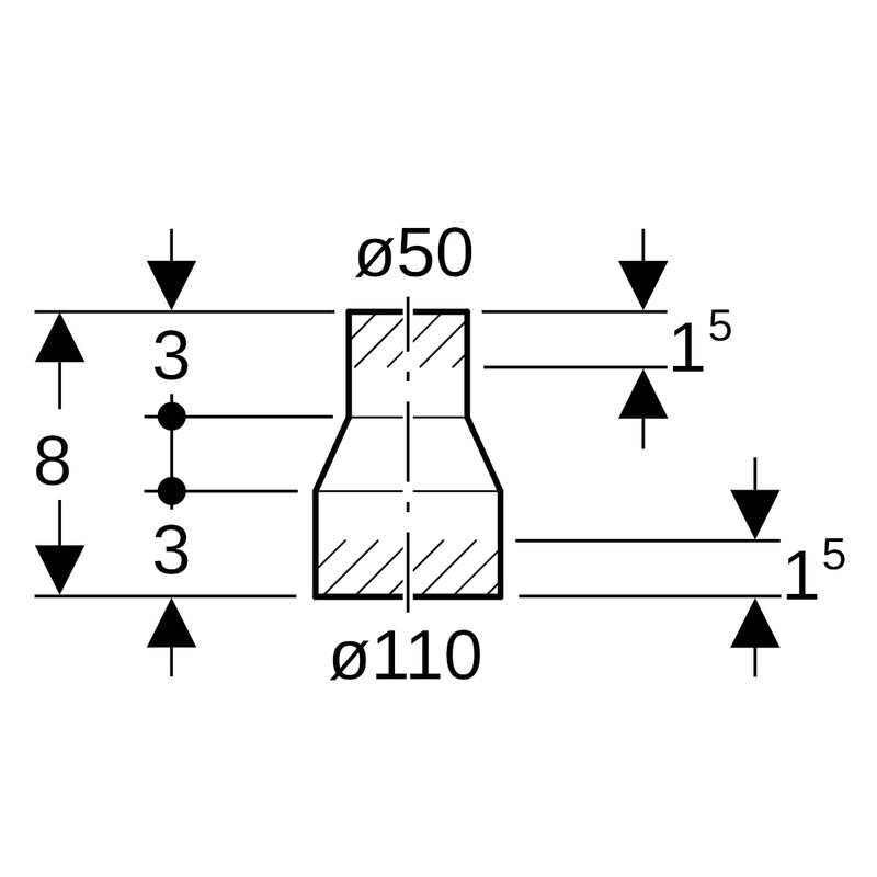 Geberit PE -supistus, keskeinen, lyhyt: d = 110 mm, d1 = 50 mm.