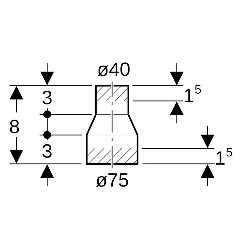 Geberit PE -supistus, keskeinen, lyhyt: d = 75 mm, d1 = 40 mm.