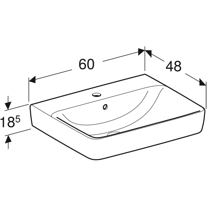 Geberit Renova Plan -tason päälle asennettava pesuallas: B = 60 cm, T = 48 cm, hanareikä = keskellä, ylivuoto = näkyvä, valkoinen.