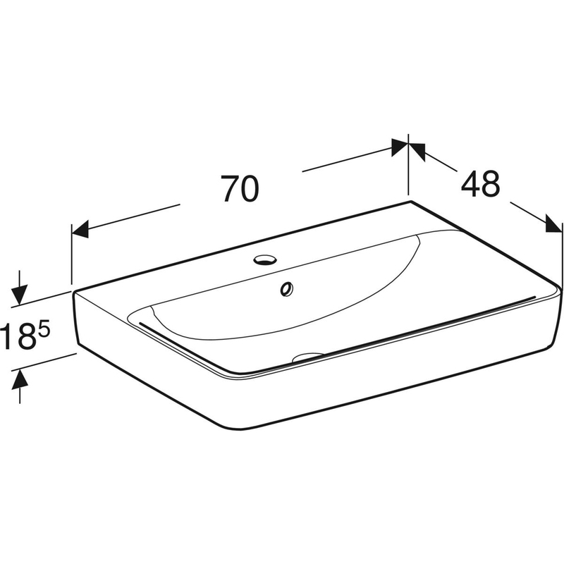 Geberit Renova Plan -tason päälle asennettava pesuallas: B = 70 cm, T = 48 cm, hanareikä = keskellä, ylivuoto = näkyvä, valkoinen.