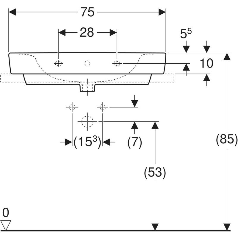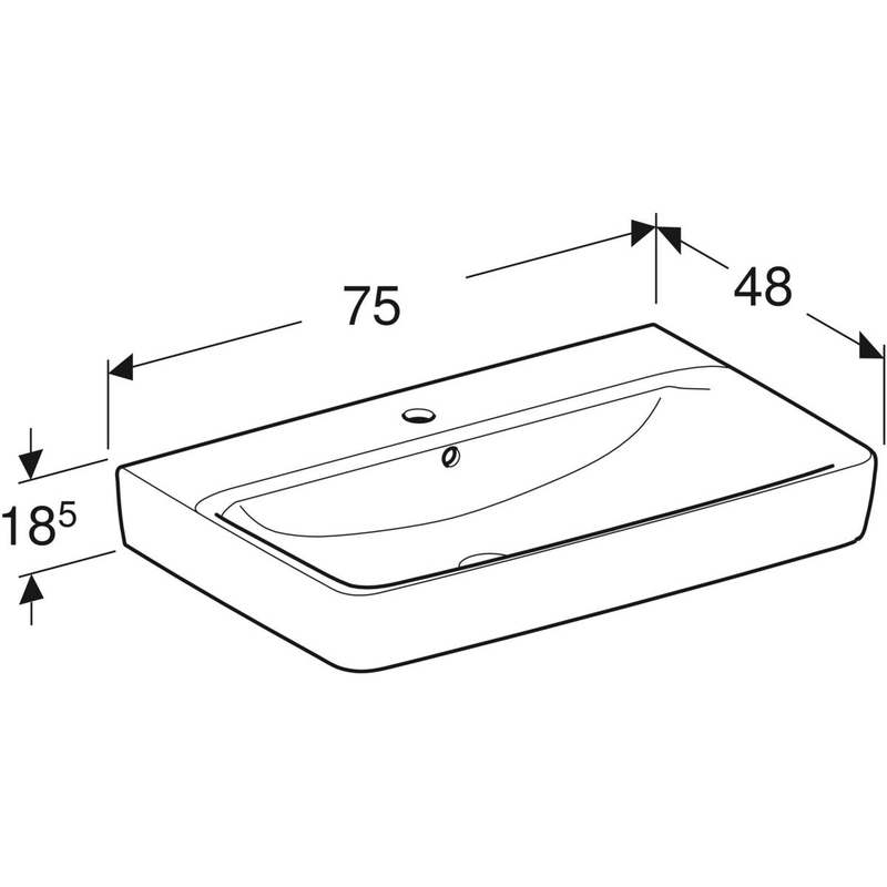Geberit Renova Plan -tason päälle asennettava pesuallas: B = 75 cm, T = 48 cm, hanareikä = keskellä, ylivuoto = näkyvä, valkoinen / KeraTect.