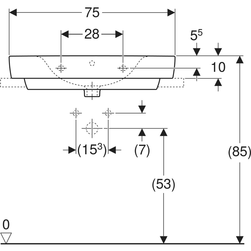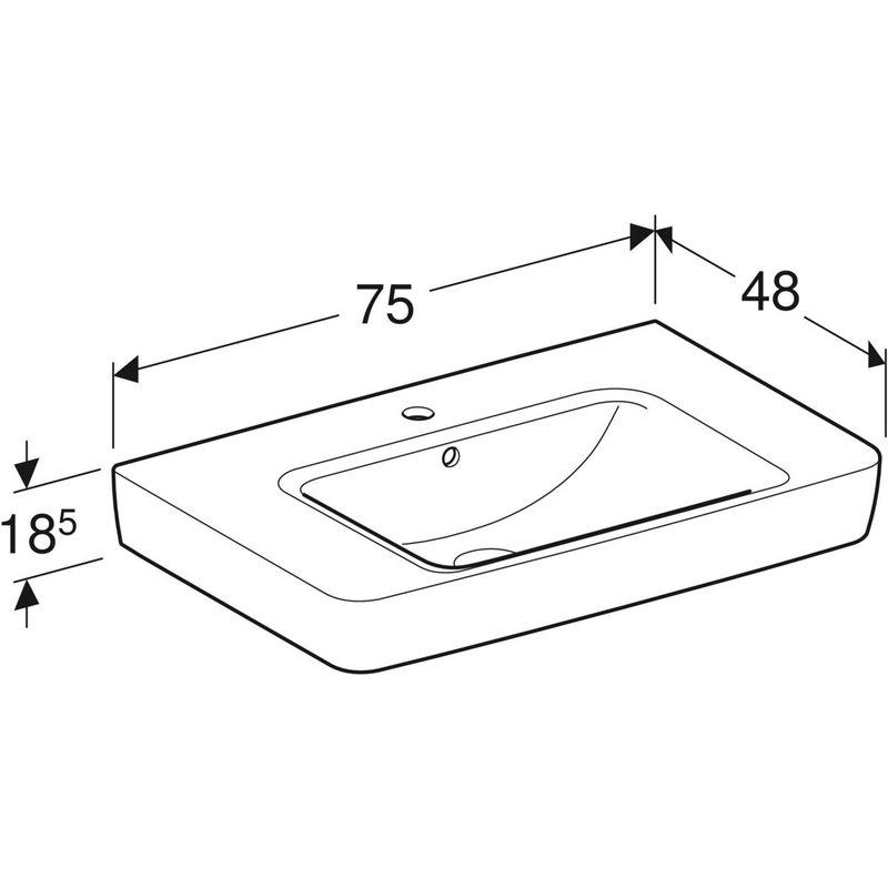 Geberit Renova Plan -tason päälle asennettava pesuallas laskutasolla: B = 75 cm, T = 48 cm, hanareikä = keskellä, ylivuoto = näkyvä, laskutaso = molemmin puolin, valkoinen.
