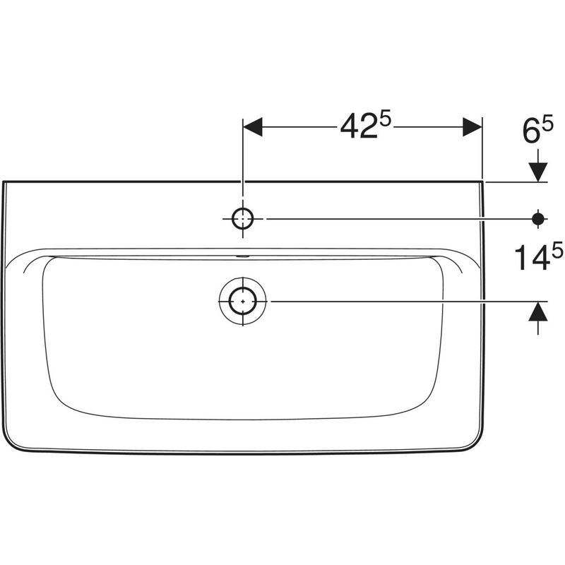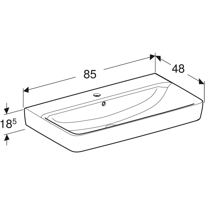 Geberit Renova Plan -tason päälle asennettava pesuallas: B = 85 cm, T = 48 cm, hanareikä = keskellä, ylivuoto = näkyvä, valkoinen.