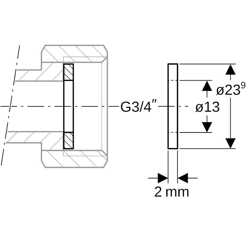 Geberit Mapress -tasotiiviste, kuitukomposiitti: da = 23.9 mm, di = 13 mm, s = 2 mm, G = 3/4". Käyttölämpötila -30 – +180 °C.
