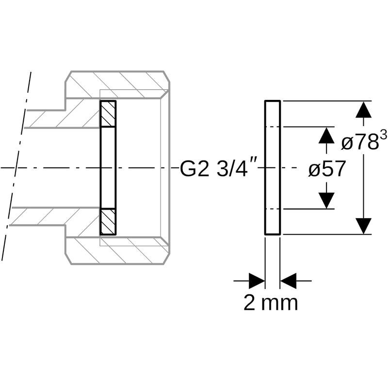 Geberit Mapress -tasotiiviste, kuitukomposiitti: da = 78.3 mm, di = 57 mm, s = 2 mm, G = 2 3/4". Käyttölämpötila -30 – +180 °C.