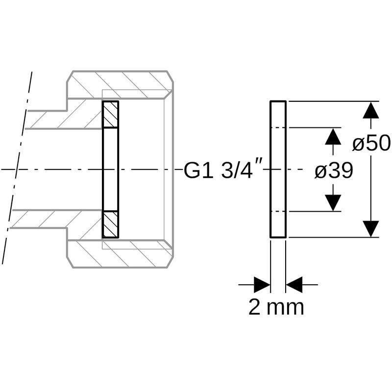 Geberit Mapress -tasotiiviste FPM vihreä: da = 50 mm, di = 39 mm, s = 2 mm, G = 1 3/4". Käyttölämpötila -30 – +140 °C.