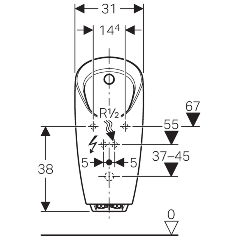 Geberit PReda -urinaali, jossa sisäänrakennettu ohjaus, verkkovirtakäyttöinen: T = 37 cm, vesiliitäntä = takana, valkoinen.