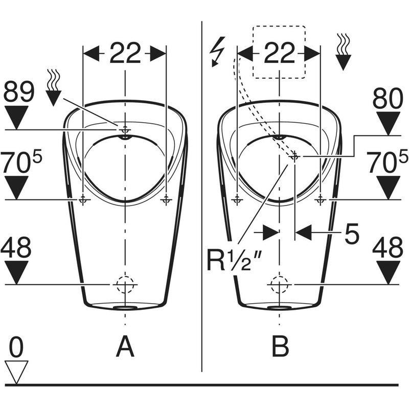 - Tuotekuvaus Geberit Renova S -urinaali on huuhtelukaulukseton malli, jossa vesiliitäntä on takana ja se voidaan viemäröidä suoraan taakse tai alaspäin. Soveltuu piiloasenteisille huuhtelulaitteille ja Geberitin piilotetuille pinta-asenteisille huuhtelulaitteille. Urinaalissa on piilotettu vesilukko ja viemärin sihti sekä kiinnitystarvikkeet sisältyvät pakkaukseen. Mitat: • korkeus: 550 mm • leveys: 330 mm • syvyys: 300 mm