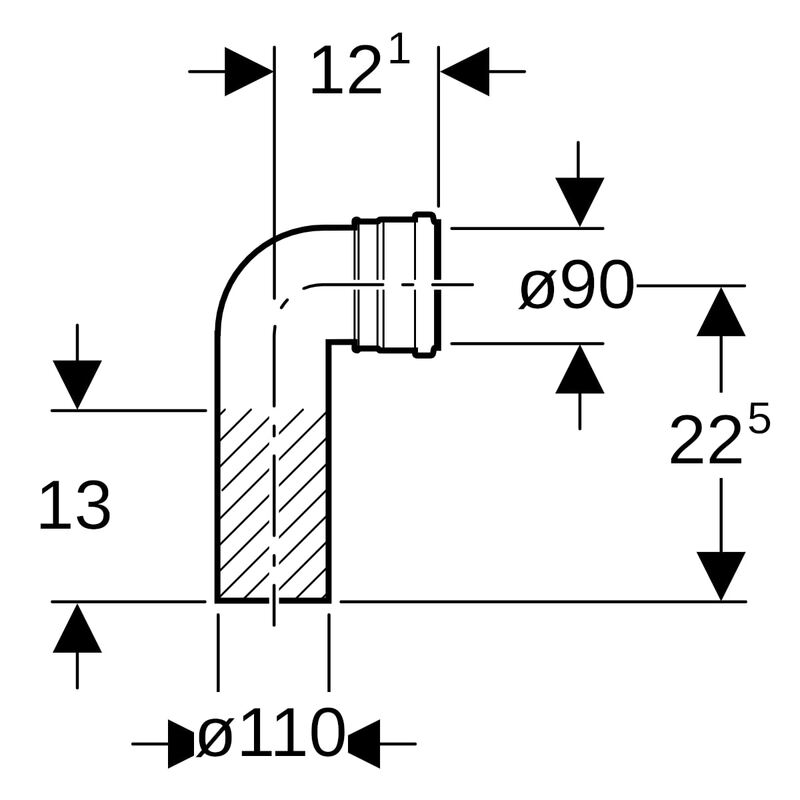 Geberit PE -liitoskäyrä 90° seinä-WC:lle: d = 110 mm, d1 = 90 mm.