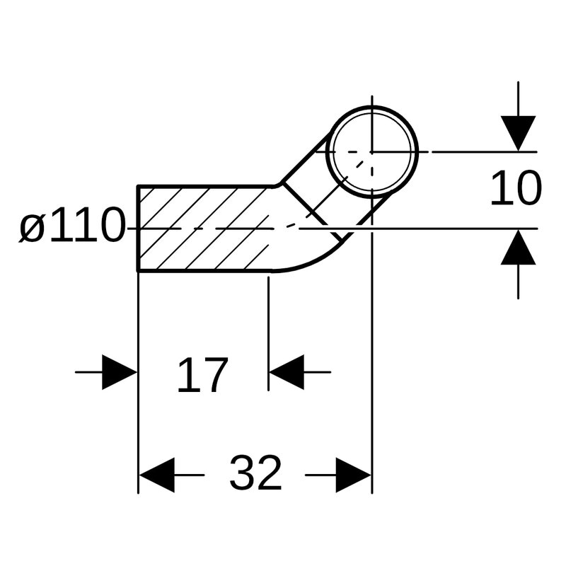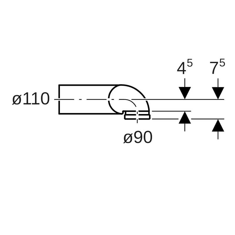 Geberit PE -viemäriyhde 90° seinä-WC:lle, poikkeama oikealle, laajennettu: d = 110 mm, d1 = 90 mm.