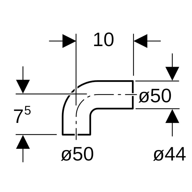 Geberit PE -viemäriyhde 90° mansettiin: d = 50 mm, d1 = 50 mm, di = 44 mm.