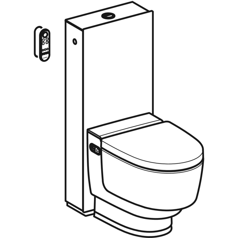 Geberit AquaClean Mera Classic -pesu-wc-istuin. Valkoinen lattia-WC/ KeraTect, valkoinen. Etupaneelit: valkoinen lasi, päätypaneeli: valkoinen puristelaminaatti.